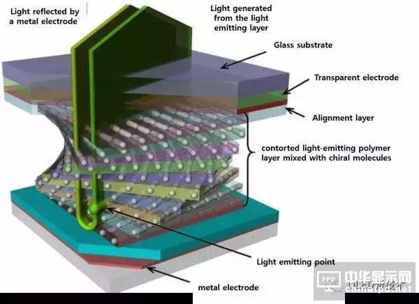 Kim Jae hoon教授解釋:“高分子OLED發光材料產生的一般都是高線性的線偏振光。當這種光穿過含有手性分子的發光層時,它可以變成了圓偏振光,理論上,相應角度的圓偏振光可以毫無損失的通過OLED偏光片,光效率提高100%,這樣就可以實現更低功耗,更亮的OLED屏幕。