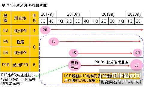 LGD計劃2017年下半至2020年上半3年內編列10兆韓元(約98億美元)資本支出在可撓式中小尺寸OLED事業(yè),其預定2017年底與2018年中分別啟用龜尾6代E5及坡州P9廠6代E6產線,并于P10廠建構1條6代可撓式OLED新產線, 目標為2020年6代可撓式OLED面板月產6.5萬片,相當于一年可供1.2億支6吋智能型手機搭載使用。