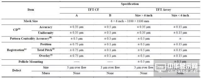 TFT 和CF 的精度不同, 所以對Photomask 的品質規格要求也有差異(Table 4)(10)。