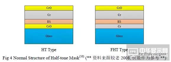 在Display 生產中, 主要使用的是石英/蘇打玻璃+鉻膜(Cr + CrO) 的Photomask 形式 (Table 3) (3)。根據透過性的不同, Photomask 可以進一步被分為Binary Mask 和Half Tone Mask (3):