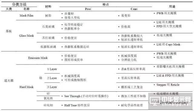 Table 1 Photomask 分類 (10) (** 資料來源較老2008, 僅能作為參考 **)