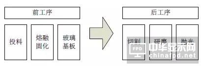 FDP 中玻璃可以分為前工序(前端)和后工序(后端)。前端工藝主要是對玻璃基板進行制作, 而后端主要是對前端制作的基板進行切割、研磨和拋光以滿足FDP 制作的需要。前端廠和后端廠工藝相對獨立且無需建設在一起, 一般后端廠會建設在FDP 面板廠附近, 如此可以在降低成本的同時方便對產線的供應。