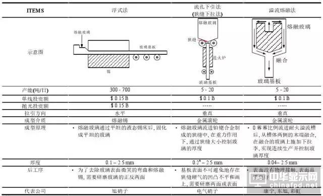現在玻璃的生產方式主要為3 種, 浮法、狹縫下拉法和溢流熔融法。三種方法的產能和工藝如Table 6 所示。