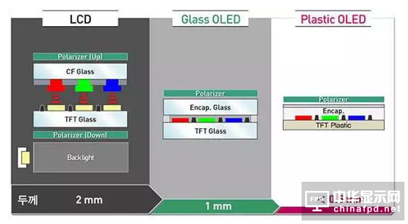 通過上面的介紹,我們知道了一個OLED屏幕的分層結構,下面可以進行塑料部件的討論。雖然第一步OLED屏幕面板使用的是玻璃基板,但是由于廠商和消費者對于各種特形顯示設備的要求,屏幕制造商開始使用更靈活的塑料材質作為基板。
