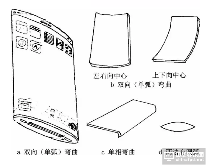 目前國外一些手機公司申請專利中幾種曲面玻璃的形狀如圖1所示。圖1中a、b均為雙向彎曲,國內稱為3D(3 Dimensional),其中a為雙弧形,b為單弧形,單弧形又分左右彎曲和上下彎曲;c為單向彎曲,國內稱為2.5D;d僅是兩邊有圓弧。