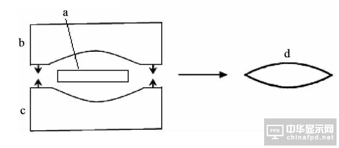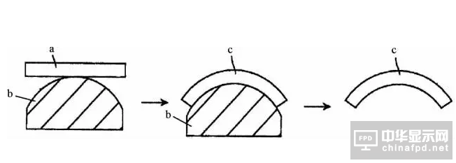 對制造曲面玻璃,熱彎是關鍵工序,蘋果公司專利中雙弧曲面玻璃(見圖1d)熱彎的工藝如圖2所示,a為平板玻璃,b為上模,c為下模,玻璃加熱后,經上下磨具壓制成雙弧曲面玻璃d。