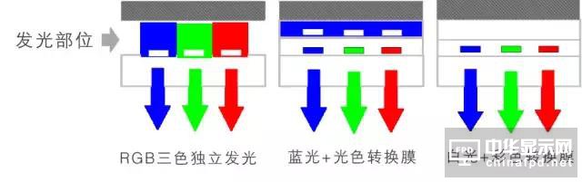 方式 | RGB 三色獨(dú)立發(fā)光 | 藍(lán)光+光色轉(zhuǎn)換膜 | 白光+彩色濾光片 |