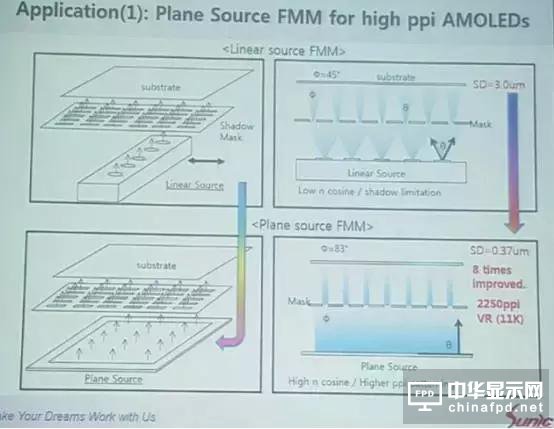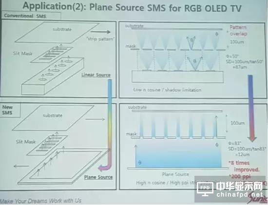 Sunic System宣稱在使用平面蒸鍍源后,由于材料幾乎是垂直蒸鍍上基板,和高ppi AMOLED面板的原理一樣,可以最小化混色的風(fēng)險(xiǎn)。