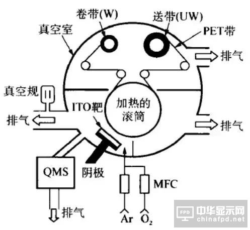 滾動條式濺射設備Noda等人在2003年發表了以卷對卷工藝制作ITO/PET ,其設備如圖所示,這種制作方式可以大量生產ITO/PET襯底,降低成本。