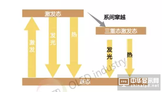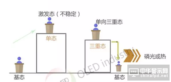 通過光的照射,讓有機分子從基態達到激發狀態,就如同讓它處于三層樓一樣,高的樓層叫“單態激發態”,這時發的光就是熒光,稍微低一點的樓層叫三重態激發態,這時的發光就是磷光。