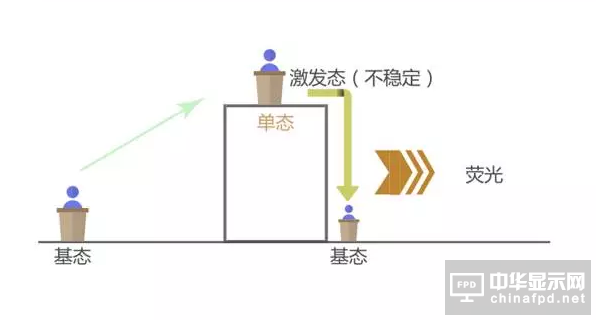 實際上,OLED的“發光”分為熒光和磷光兩種,發光就是“先實現高能量狀態的,然后從這個高能量狀態躍遷下來并釋放能量”這種“高能量狀態”分為兩種,可以想象為這樣: