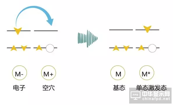 電子和空穴的再結合,就是獲取電子的分子和失去電子的分子之間的電子授受反應,反應后的激發狀態下的電子自旋方向相反的時候,就是單態激發態,因為不穩定所以會降回原來的軌道,這時就發出熒光。