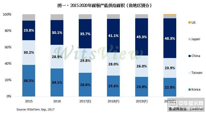 根據集邦咨詢光電研究中心(WitsView)最新數據,從面板產能供給面積的地區別來看,2017年中國大陸將正式超越韓國成為大尺寸面板供給面積最大的地區,預估2020年中國大陸供給率將朝50%邁進。