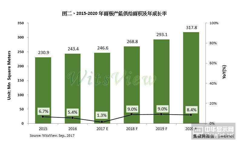 受到韓廠收斂產能影響,2017年全球大尺寸面板產能面積估達2.47億米平方,年增長僅1.3%,為近2-3年增幅最少的一年。不過隨著2018年至2020年將有六條10.5代線產能陸續開出,將帶動產能面積快速增長,預期2018-2020年大尺寸面板產能面積成長率每年將以8-9%的速度增加,至2020年總面積將達3.18億米平方。