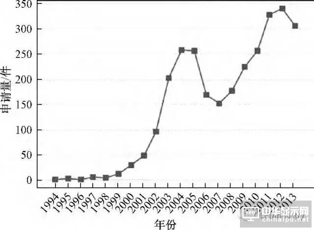 2004—2013 年這一階段OLED 設(shè)備的專利申請數(shù)量先下降,從2007 年開始又逐漸上升,在每年的申請量都大于150 件,對OLED 的研究和一些相關(guān)的技術(shù)方面變得相對成熟,對其重視程度只增不減。