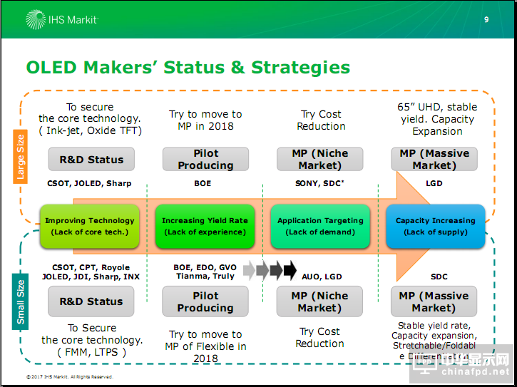 市場對下一代顯示技術(shù)的焦點儼然已經(jīng)聚焦在OLED上了,各大面板廠紛紛加碼對OLED的投資,使用了OLED的終端產(chǎn)品也越來越豐富。但OLED的發(fā)展仍面臨一定的問題。在2017中國國際OLED產(chǎn)業(yè)大會上,IHS顯示部門研究總經(jīng)理謝勤益指出了OLED發(fā)展中十個主要的課題。
