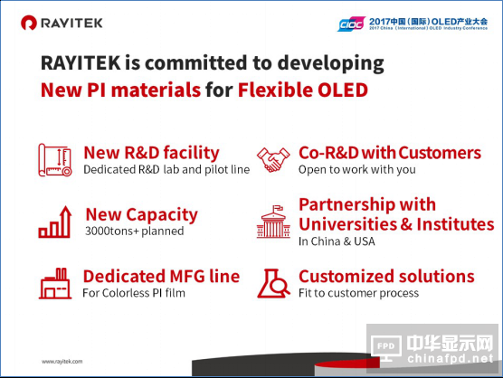 Rajan K.Kanakarajan博士介紹,瑞華泰于2005年在深圳成立,一直致力于高性能聚酰亞胺材料的研發與生產,目前已經成為中國自有技術聚酰亞胺產業領跑者。針對OLED柔性發展需求,瑞華泰推出OLED顯示用聚酰亞胺解決方案,向產業提供數種薄膜或樹脂形態的聚酰亞胺產品,具備杰出的熱性能、力學性能、光學性能,柔性等,以應對OLED中不同結構、組件、工藝、設計中的材料應用需求。