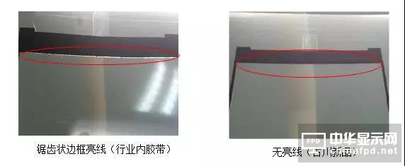 另外,隨著手機顯示模組大尺寸、薄型高亮化、模組點亮后容易在邊框出現一條鋸齒狀亮線(如圖所示)。2014年古川得到客戶反饋情況及需求,行業內最快速度開發出新產品來解決模組邊框亮線問題。2014年古川公司通過調整膠帶結構及膠水內部配方后,開發出專門解決邊框連線的系列新品,并申請專利。