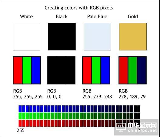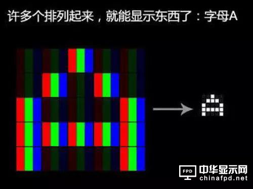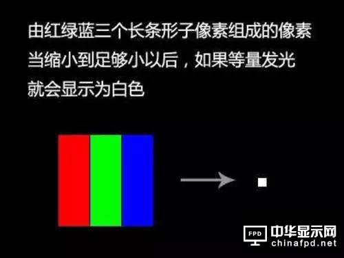 顯示的基本原理,是由紅綠藍 (RGB) 三原色光條并列組成像素 (Pixel),任何色彩都可經 RGB 色光不同的深淺層次的搭配制造出來,放大看雖是分開的三個條狀色光,但像素非常細小,肉眼的適當距離看上去則是三色的混合光。顯示屏是由許許多多的像素構成的,而為了讓每一個單獨的像素可以顯示出各種顏色,就需要把它分解為紅綠藍三個比像素更低一級的子像素。即,3個子像素構成一個整體,即彩色像素。當需要顯示不同顏色的時候,三個子像素分別以不同的亮度發光,由于子像素的尺寸非常小,在視覺上就會混合成所需要的顏色。