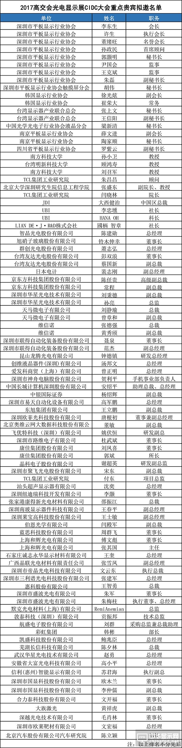 第十三屆中國國際顯示大會(CIDC2017)以“創新與超越”為主題,涵蓋顯示峰會、“聯得裝備”圓桌高峰論壇及人工智能即將來襲·全面屏的變數-2017手機黑科技技術及投資峰會。大會將邀請三星、LG、JDI、維信諾、華星光電、友達、京東方、天馬微電子、和輝光電、信利等面板廠商,康寧、默克、凸版印刷、聯得裝備、東電、日東、上海微電子、康耐視、TOPCON、東麗華科技、紐迪瑞科技等材料和裝備廠商,創維、康佳、TCL、海信、樂視、華為、小米等電視和手機廠商,航盛電子、天派電子等車載顯示廠商,以及國際信息顯示學會(SID)、日本畫質學會(SPQE)、韓國顯示行業協會(KDIA)、臺灣顯示器產業聯合總會(TDUA)、中國光學光電子行業協會液晶分會(CODA)等國內外行業協會代表性的企業家、技術專家、學者、教授、工程師以及金融界、投資界、新聞媒體界的精英人士300余人共同參會。