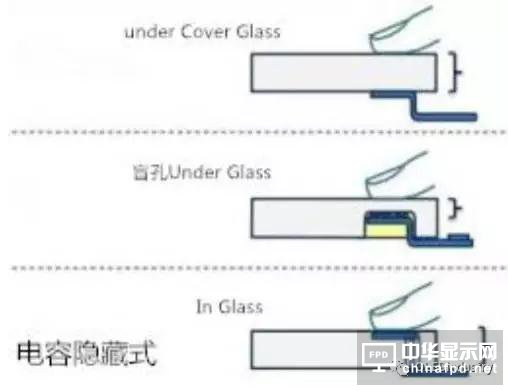 隱藏式又分三種,Under Glass 需要在玻璃蓋板上挖盲孔,目前工藝要求高,良率比較低;In Glass 將Sensor 融合進玻璃之中,工藝難度大,目前不具備量產(chǎn)條件;Under Cover Glass 方案達到電容識別極限,目前效果比較差。