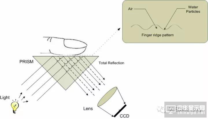 光學(xué)指紋識別是目前使用最廣泛的指紋識別技術(shù),它的原理是將手指放在光學(xué)鏡片上,手指在內(nèi)臵光源照射下,用棱鏡將其投射在電荷耦合器件上,進而形成脊線呈黑色、谷呈白色的數(shù)字化的、可被指紋設(shè)備算法處理的多灰度指紋圖像。