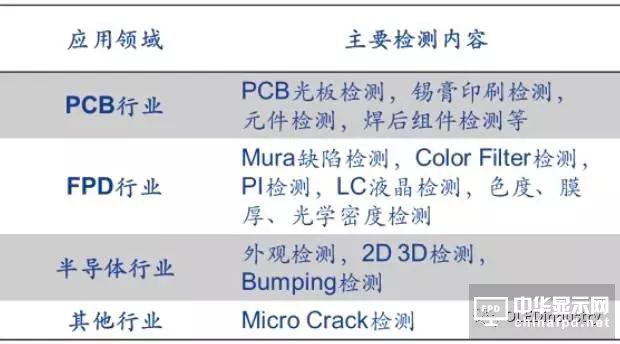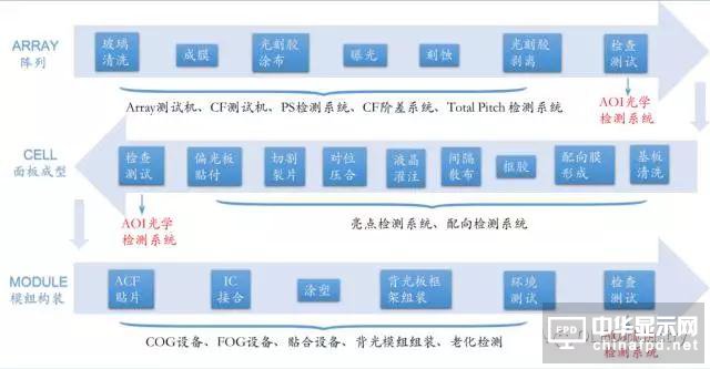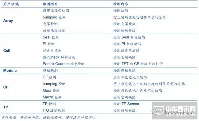 面板制造可分為 Array 、Cell 、Module 三道工序,三道工序均需要引入 AOI 檢測設備 ,且每一制程要求的檢測項目各不相同,需 根據應用場景 對設備進行針對性的開發(fā)。
