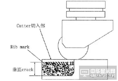 利用高滲透刀輪以一定的壓力和速度切割玻璃基板,高滲透刀輪進入玻璃后使玻璃產生裂紋,開始部位由于玻璃壓縮力的作用產生肋狀裂紋(Rib Mark),然后在玻璃內部張力作用下裂紋向下延伸產生平直的垂直裂紋(Median Crack)和水平裂紋(Lateral Crack),垂直裂紋生長到基板厚度的80%~90%,使玻璃斷裂。