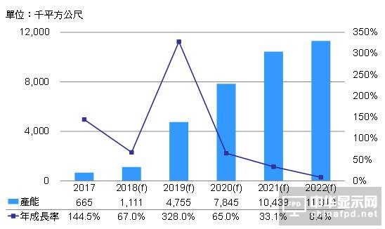 2017~2022年大陸廠商6代及以下AMOLED面板產(chǎn)能變化及預(yù)測(cè) (中性情境)