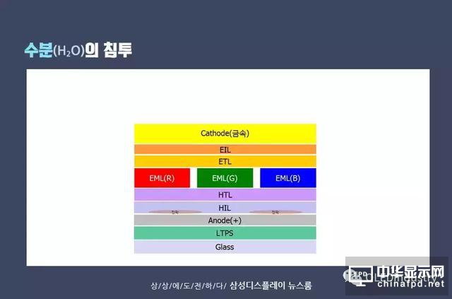 水分滲透時也存在問題。當水(H2O)穿透面板的微小間隙時,水中的氫通過電化學反應與氧分離,產生的氫氣(H2)會形成氣泡。這些氣泡使陰極層浮動,使電子難以在陰極和EIL之間傳輸。就像氧氣滲透一樣,這也會產生黑點。