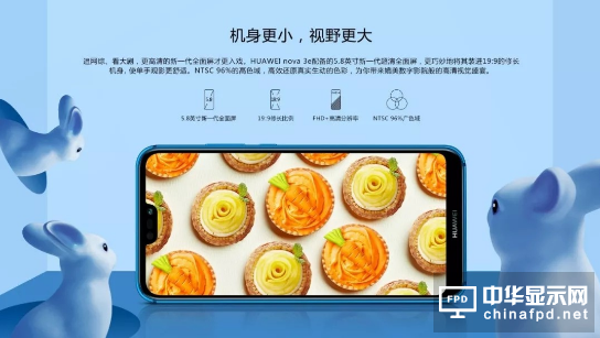 3月20日,天馬與華為強強聯手,正式推出華為首款notch全面屏手機HUAWEI nova 3e。HUAWEI nova 3e采用了天馬的5.84英寸notch全面屏,分辨率為2280x1080,NTSC色域高達96%,對比度達到1500:1。這款機型的屏幕比例為19:9,相較市面上常見的18:9全面屏,機身會顯得更加修長,握持體驗更出色。同時,HUAWEI nova 3e在屏幕色彩飽和度和亮度方面進行了優化,降低了在室外非太陽直射下的功耗,并能支持屏幕色溫調節和護眼模式。