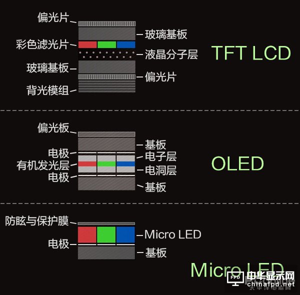 即便搞不懂這三種屏幕技術的具體原理,光看上面的結構圖也不難看出,Micro LED一大優勢是薄,而且體積很小。