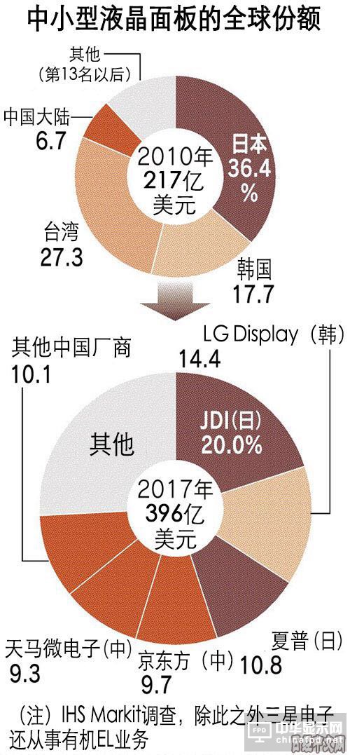 據IHS Markit調查,天馬中小型液晶面板的出貨額(2017年實際業績)為37億美元,同比大幅增長66%。京東方科技集團(BOE)也同比增長26%。中國面板廠商的市占率達到約30%,迅速增長到可與日本顯示器(JDI)及夏普等日本企業比肩的水平。