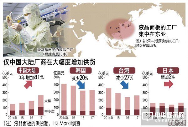面板產業的技術從日本傳到韓國、臺灣,如今又傳到中國大陸。以鉅額資金為背景,擁有后發優勢的中國大陸廠商也開始掌握生產技術,日韓臺廠商將難以確保技術優勢。源自中國的供應過剩在鋼鐵和光伏面板等領域曾經多次出現,或許也將蔓延到面板產業。