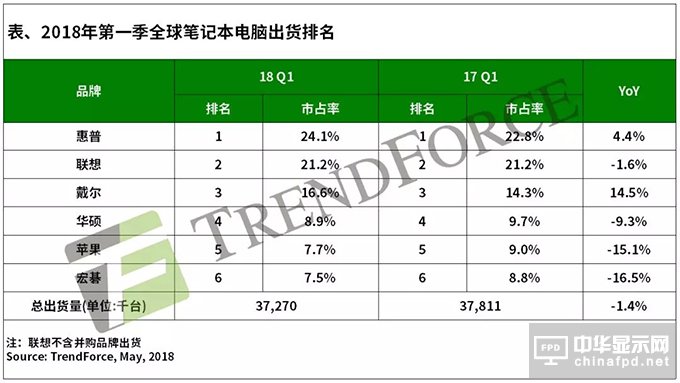 聯想近幾年受到大集團組織更迭影響,出貨動能消散,第一季出貨僅790萬臺,與去年同期相比衰退1.6%。然而第二季由于公司內組織改革大致底定,若在接下來幾個季度能全力沖刺出貨,無疑將帶動中國大陸筆電出貨表現。