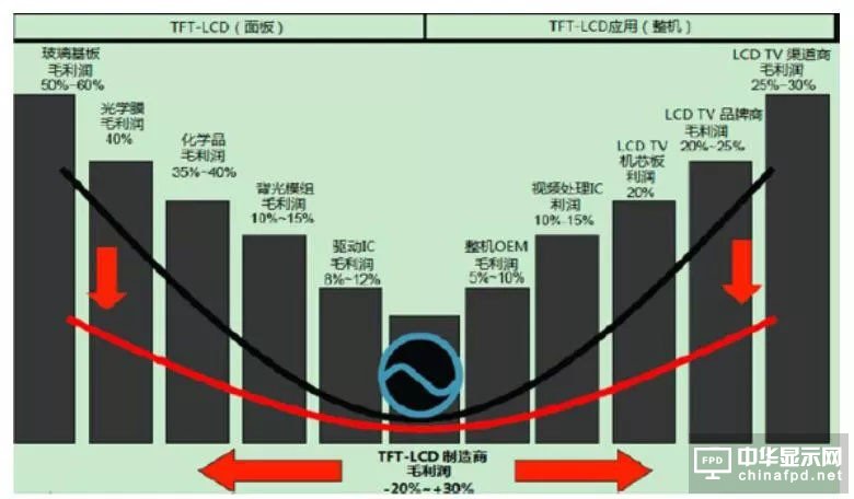 其中,偏光片行業重要的下游終端應用之一是TFT-LCD,其產業鏈的毛利率水平構成了“微笑曲線”,曲線左邊是上游的玻璃基板、光學膜材(包括偏光片)、化學品和背光模組等相關供應商,屬于全球性競爭;曲線中間是液晶面板及模組制造廠商;曲線右邊是下游整機組裝、整機品牌商和渠道經銷商,主要是當地性競爭。在產業鏈中,高附加值、高毛利的部分體現在兩端,即原材料和銷售,包括上游產業中的偏光片行業,利潤水平約為40%。