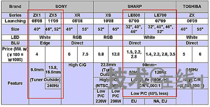 日本廠商方面,首先,索尼推出了40英寸/46英寸/52英寸的“ZX1/ZX5”。其背照燈單元采用邊緣發光型白色LED。夏普上市了32~52英寸的“LE600/LE700”。其LED背照燈采用直下型白色LED。該公司主打的賣點包括10萬小時的長壽命和4000:1的高對比度,目標市場為歐洲和北美。東芝也通過上市配備直下型白色LED背照燈的46英寸/55英寸240Hz驅動款式,向市場投放了多款產品,2010年后上市的新品可能大部分都是LED TV(圖1)。