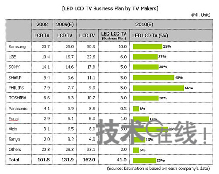 綜合以上信息,2010年各電視廠商的LED TV總生產計劃為4100萬臺。這大約相當于液晶電視總產量1.62億臺的25%。但部分廠商可能會根據LED TV主要部件的供需情況調整目標。