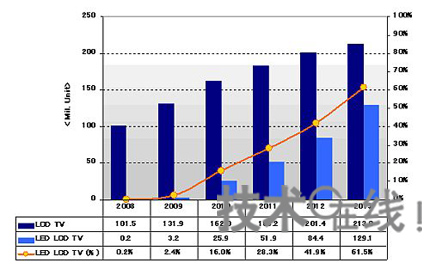 在此之前,LED TV一直被視為高端機型,但各廠商的生產計劃超過了人們對于高端LED TV的需求。也就是說,到2010年,LED TV將從高端機型降格為普通機型,各種尺寸和價位預計都會有大量產品上市。而且,為了使價格低于原有的冷陰極管(CCFL)背照燈液晶電視,降低成本的革新也將進一步擴展。