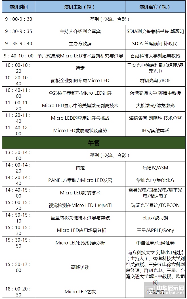 大會將邀請三星、APPLE、Sony、臺灣工研院、香港科技大學、TCL工研院、南方科技大學、海德漢、ASM、镎創科技、海信集團、群創光電、BOE、三安光電、華燦光電、集創北方、歐司朗、隆達電子、雷曼光電、國星光電、瑞豐光電、eLux、瑞淀光學系統、Topocn、德龍激光、大族激光、德龍激光、中信證券、海通證券、天風證券奧維睿沃、IHS、行家說等企業的領軍人物及眾多產業精英共同參會。