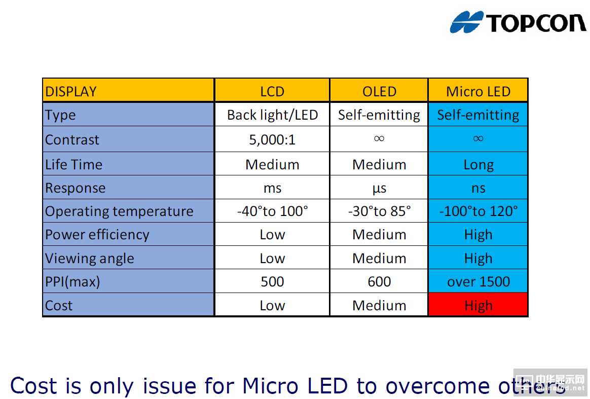 將LCD、OLED、Micro LED三種技術進行對比,西川和人認為,三者之間最大的差異在于成本——這也是Micro LED和OLED進入市場的最大障礙。作為一家從事光學檢驗的公司,Topcon與很多客戶合作,極大地提升了Micro LED在制作過程中的良品率。他介紹說,在量產之前對產品進行檢驗,識別出存在缺陷的零部件,利用算法和軟件向客戶進行反饋后,客戶可對產品進行優化,這有助于客戶減少制造成本。