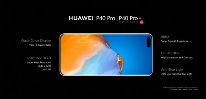 P40配備一塊 6.1英寸雙打孔屏幕,據此前供應鏈消息是由京東方供應。而華為P40 Pro和P40 Pro+正面采用了一塊 6.58 英寸AMOLED屏幕,則由三星和LG顯示、boe提供,分辨率為 2640×1200(441 PPI)。這塊柔性OLED屏幕支持90Hz高刷新率,以及 DCI-P3 高色域和 HDR 認證。