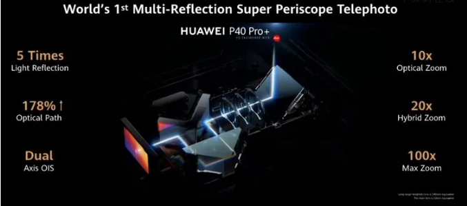 華為 P40 Pro上采用潛望式長焦鏡頭,支持5倍光學變焦、10倍混合變焦、以及50倍最大變焦。同時首次在長焦上加入RYYB陣列,支持4K延時攝影。