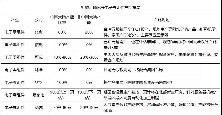 被動組件廠部分,目前產能高度集中在中國大陸的廠商中,多數仍未有異動打算,主要是被動組件輕薄短小的產品特性,對終端廠商而言,還不足以對成本形成嚴重威脅,后續待態勢更加明確再轉移也不遲。