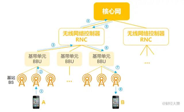 語音傳輸的路徑更是非常麻煩,如圖5所示,A想給B打個電話需要經過很長的物理路徑,需要沿著藍色的路徑,經過8個階段才能把語音傳輸到B,2G和3G的語音過程都是這樣。