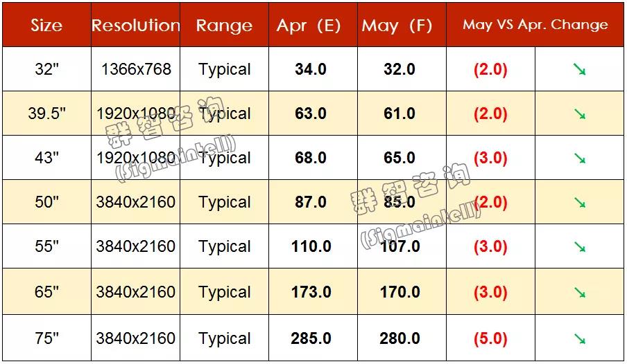 大尺寸電視面板5月需求仍然疲弱,不過55吋面板受到韓國面板廠退出預期刺激,價格跌幅逐步收斂,4月價格跌幅4美元,5月收斂至3美元。此外,北美需求走弱對于65吋以上的超大尺寸面板需求影響大,4月65吋面板價格下降5美元,75吋跌幅超5美元,預計5月維持單月5美元的跌勢。