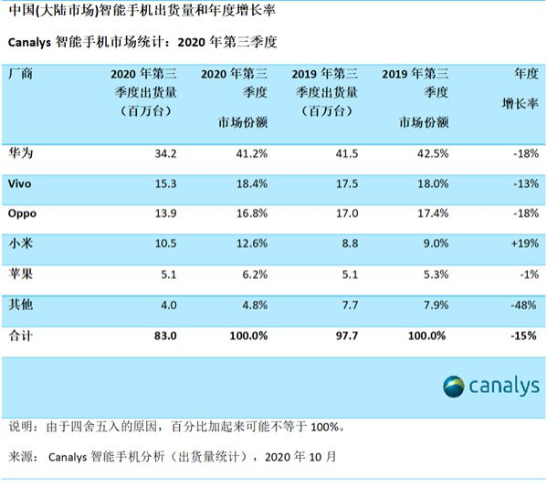 市場調研機構Canalys近日發布了2020年第三季度出貨量報告。報告顯示,中國智能手機市場較上季度下滑8%,較去年下降15%,第三季度出貨8300萬臺。華為依然排名第一,出貨量是排名第五的蘋果的六倍。
