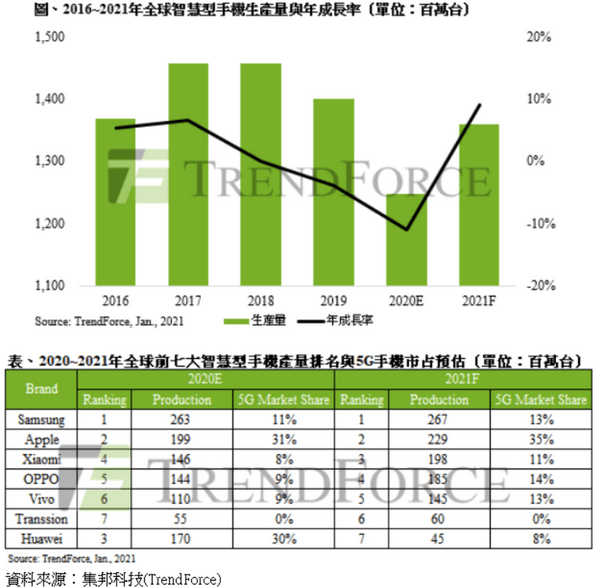 TrendForce指出,2020年受到中國政府積極推動5G商轉的帶動,全年5G智能型手機生產總量約達2.4億支,滲透率19%。其中中國品牌市占約六成。2021年市場將持續圍繞5G話題,隨著各國陸續恢復5G建設,行動處理器大廠也相繼推出中低階5G芯片,預估全球5G智能型手機生產總量約5億支,滲透率將快速提升至37%。