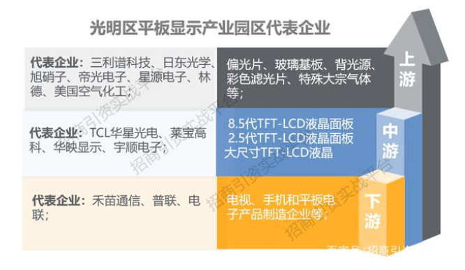 深圳新型顯示產(chǎn)業(yè)發(fā)展過程中形成了“龍頭企業(yè)-重大項目-產(chǎn)業(yè)鏈條-產(chǎn)業(yè)集聚-產(chǎn)業(yè)基地”的集群發(fā)展模式。光明區(qū)平板顯示產(chǎn)業(yè)園是國家新型顯示十大園區(qū)之一,TCL華星光電作為其“產(chǎn)業(yè)航母”,拉動上下游配套產(chǎn)業(yè)鏈發(fā)展。目前,光明區(qū)已形成一條完整液晶顯示產(chǎn)業(yè)鏈集群:包括上游原材料生產(chǎn)環(huán)節(jié)的三利譜科技、日東光學、旭硝子等;中游液晶面板及模組生產(chǎn)企業(yè)項目包括華星光電、萊寶高科及華映顯示等;下游品牌制造商還有大量的電視、手機和平板電子產(chǎn)品制造企業(yè)聚集。