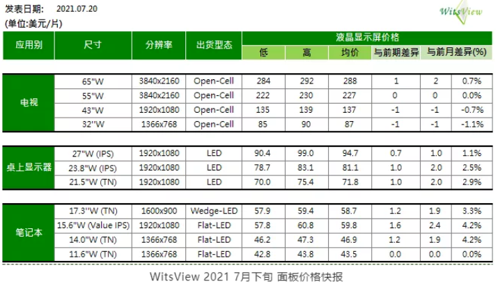 根據(jù)Witsview 統(tǒng)計,7月下旬32、43吋電視面板轉跌;55吋電視面板止?jié)q,7月報價227美元,與上月持平;65吋以上大尺寸電視維持漲勢,但漲勢收斂,7月平均上漲1美元平均報價288美元。
